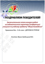 Поздравляем. Победителя заключительного этапа конкурса работ исследовательского характера (конференции) учащихся по учебному предмету "Обществоведение"
